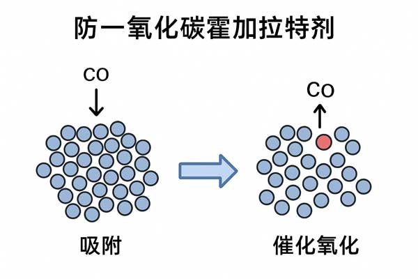 防一氧化碳霍加拉特劑的工作機(jī)制主要依靠催化反應(yīng)和表面吸附相結(jié)合: