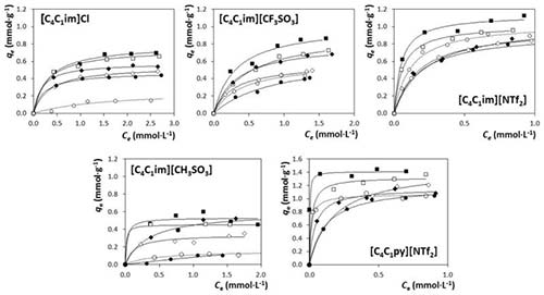 得到的結(jié)果表明,活性炭的不同的吸附能力與IL的性質(zhì)和溶液中的鹽量有關(guān)。一般而言,對(duì)于咪唑鎓的ILs,陰離子對(duì)其對(duì)活性炭的吸附能力的影響按照以下順序:Cl - ≈[CH 3 SO] <[CF 3 SO 3 ] -<[NTf 2 ] 。這一趨勢(shì)的結(jié)果和預(yù)計(jì)的相符合,并且表明,隨著陰離子疏水性的增加,活性炭對(duì)ILs的吸附逐漸增加。另一方面,考慮到IL陽(yáng)離子家族,活性炭能吸附更多的吡啶鎓比基于咪唑類(lèi)的對(duì)應(yīng)物。總之,這里證明,如果伴隨使用無(wú)機(jī)鹽來(lái)促進(jìn)鹽析現(xiàn)象并增強(qiáng)隔離度,則活性炭也可以用作水介質(zhì)中低濃度存在的親水性IL的有效吸附劑。得到的結(jié)果表明, 在鹽的存在下,親水性ILs的例如[C 4 C 1 im] Cl和[C 4 C 1 im] [CH 3 SO3 ]的K d值增加高達(dá)5.5倍。這種新方法可以被設(shè)想為減少由使用IL的工業(yè)過(guò)程產(chǎn)生的含水物流污染的有希望的途徑。