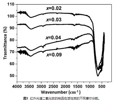 圖1示出了TiO 2的樣品的紅外光譜在活性炭的不同摩爾分?jǐn)?shù)。對(duì)于浸軟的手動(dòng)獲得的化合物,譜圖顯示在3440cm -1處的譜帶,這與H-OH振動(dòng)模式應(yīng)力相關(guān)聯(lián),并且透射率或紅外吸收碳隨著濃度的降低而增加。由于活性炭的存在,在2908cm -1處發(fā)現(xiàn)了由于芳香族基團(tuán)的CH鍵而形成的譜帶,觀察到該譜帶通過(guò)降低碳含量而急劇下降。1630cm -1處的帶對(duì)應(yīng)于水彎曲模式。具體看1000到400厘米-1寬帶被定義為活性碳含量增加。該區(qū)域的特征譜帶位于680 cm -1處,可與官能團(tuán)Ti-O-Ti和官能團(tuán)Ti-O的振動(dòng)模式相關(guān)聯(lián)。通常,在圖1中觀察到強(qiáng)度隨著活性炭含量的降低而增加,這表明在低的碳摩爾分?jǐn)?shù)下各種結(jié)合的形成更強(qiáng)。