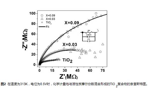 表1化學(xué)計(jì)量學(xué)與活性炭摩爾分?jǐn)?shù)混合的TiO2的等效電路的參數(shù)值,在313K的溫度下獲得。