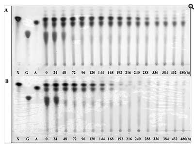 圖3、嗜熱脂肪芽孢桿菌的燒瓶培養(yǎng)肉湯的TLC分析。G,A和X分別表示葡萄糖,阿拉伯糖和木糖標(biāo)準(zhǔn)品。