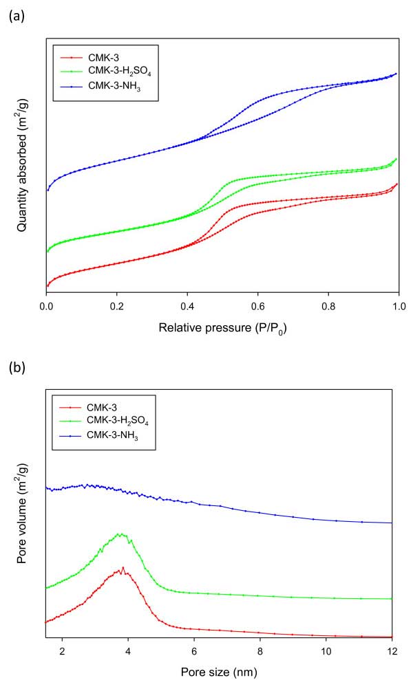 表1列出了本研究中使用的活性炭的物理性質(zhì)。活性炭-3的比表面積為1178m 2 / g。經(jīng)硫酸處理后比表面積略有下降至1,002m 2 / g,經(jīng)氨處理后比表面積大幅度上升至1663m 2 / g。圖2示出了氮氣吸附等溫線和孔碳的孔隙大小分布。圖2a示出了用于活性炭-3,活性炭-3-H的氮吸附等溫線2 SO 4,和活性炭-3-NH 3。所有樣品在0.5 的相對壓力(P / P 0)下都顯示典型的介孔材料的IV型等溫線。表表11表明,CMK-3具有的3.8納米的孔徑中孔。用硫酸處理后維持這些中孔。當(dāng)活性炭-3用氨處理時,平均孔徑減小到3.1nm。氨處理是高溫(900℃)工藝,其產(chǎn)生微孔,引起表面積的大量增加和平均孔徑的減小。另一方面,大部分介孔活性炭-3在氨處理后保持。
