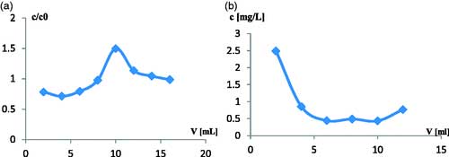 圖2.(a)氧化活性炭上銨離子(NH4+)的SPE(c/c0=f(V))過(guò)程中的穿透曲線(xiàn)。(mcar=0.104g ,離子濃度c=NH4+- = 0.661mg/L)。指定每5ml濾液的比例c/c0。(b)經(jīng)過(guò)SPE柱分析每2ml洗脫液后,來(lái)自經(jīng)氧化的活性炭的銨離子解吸曲線(xiàn)(c= f(V))。