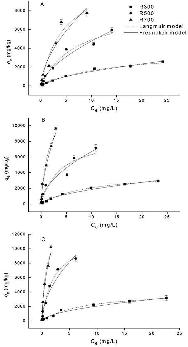 圖2.活性炭上四環(huán)素的吸附等溫線。吸附溫度是(A)15℃,(B)25℃和(C)35℃。