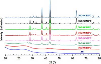 由活性炭和活性炭負載的鎳在不同的熱處理溫度下記錄的X射線衍射圖如圖1 所示。在200中被加熱的樣品 ℃,在2θ顯示有2個衍射峰 = 23.5和43.5°,對應(yīng)于(0 0 2),(1 0 無定形活性炭0)指數(shù)平面。另外,隨著煅燒溫度從300 ℃ 升高到800 ℃ ,反射次數(shù)增加,表明添加的催化劑在2θ = 37.1°,43.2°,62.7°和75.3° 處被氧化成氧化鎳 。這些角度分配給(1 1 1),(2 0 0),(2 2 0)和(3 1 1)面,立方晶體的氧化鎳。此外,對于400-800 ℃ 煅燒的樣品,在對應(yīng)于(2 2 2)的2θ = 79.3° 處觀察到新的峰。氧化鎳峰的強度也隨著煅燒溫度的增加而增加。