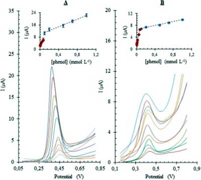 圖2、使用DPV方法在的氧化鎳活性炭自來水中(A)和橄欖油(B)樣品的苯酚校準曲線改性的碳電極在1.0的濃度范圍 × 10 -6 mol L−1至1.0 × 10 -3 mol L−1。