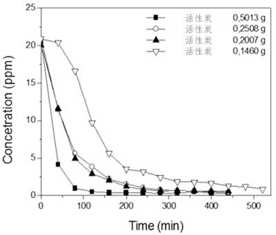 使用不同的質(zhì)量對活性炭的4-硝基酚吸附容量清楚地表明,在較低的質(zhì)量下,以mg g-1表示的吸附容量較高,盡管這是在較高的飽和時間獲得的。這偏離了預(yù)期,因?yàn)槲饺萘繎?yīng)該標(biāo)準(zhǔn)化為每克吸附劑,因此應(yīng)當(dāng)獨(dú)立于所使用的吸附劑質(zhì)量。這個意想不到的結(jié)果主要是由于擴(kuò)散問題,例如搖動,意味著當(dāng)降低間歇系統(tǒng)中的擴(kuò)散阻力時獲得更高的效率,導(dǎo)致4-硝基酚溶液更均勻的分布,同時溶液之間質(zhì)量增加的接觸減少和吸附劑。