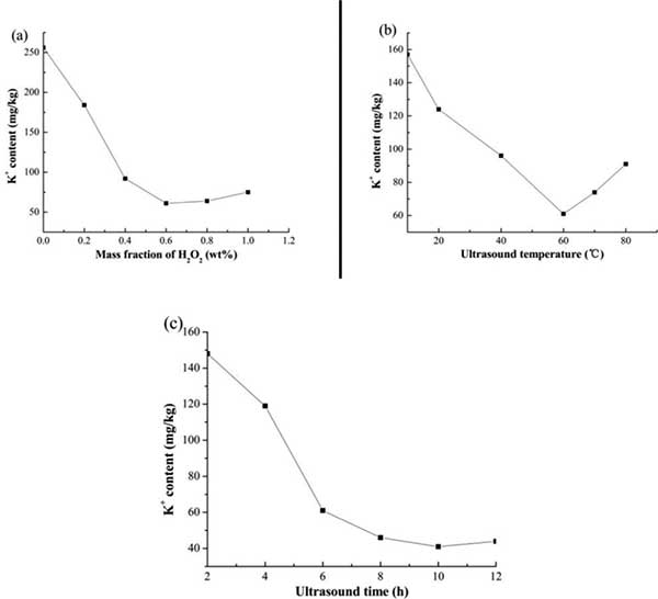 然后對活性炭(AC-WH 1%/ 120min)進(jìn)行氧化 - 超聲處理以深度除去鉀離子。研究了H2O2溶液的質(zhì)量分?jǐn)?shù),超聲溫度和超聲時間對活性炭中鉀離子含量的影響。得到的結(jié)果和圖2所示。H2O2溶液的質(zhì)量分?jǐn)?shù)在超聲時間6小時和超聲溫度60℃下在0-1.0重量%的范圍內(nèi)。表明不含H2O2的活性炭的鉀離子含量處理量為256 mg / kg,大大低于活性炭(AC-WH 1%/ 120min)和417 mg / kg,這與超聲波作用能夠加速固體間的液體傳質(zhì)過程,促使交流孔內(nèi)的一些非碳化物質(zhì)與鉀離子一起分散到溶液中。從圖2(a)可以看出,活性炭的鉀離子含量從256顯著降低到61 mg / kg,此后當(dāng)H2O2溶液的質(zhì)量分?jǐn)?shù)從0增加到0.6 wt%時,基本保持不變。。因此,可以說H2O2處理對生產(chǎn)低鉀離子含量的活性炭有很大的影響。一方面,作為氧化劑,H2O2溶液可以減小鉀離子和活性炭孔壁之間的作用力,使其容易轉(zhuǎn)移到溶液中。另一方面,活性炭中的鉀離子可以與一些有機(jī)基團(tuán)以化學(xué)鍵的形式共存,這些有機(jī)基團(tuán)可以通過H2O2溶液的存在而被破壞,使得可以有效的去除活性炭中的鉀離子。