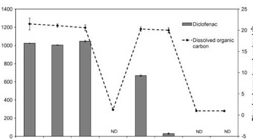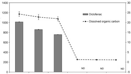 使用活性炭除去雙氯芬酸鈉是定性高效的,通過零吸收和低濃度的DOC的,并且在通過所獲得的色譜中沒有檢測到雙氯芬酸鈉。得在所研究的處理階段中,在活性炭上的吸附導(dǎo)致最顯著的雙氯芬酸鈉去除。因此,雙氯芬酸鈉沒有水樣中的這個階段(LOD之后檢測 = 2 μg L−1)�?紤]到所述方法的定量限為3 μg L−1,通過活性炭除去雙氯芬酸鈉的至少99.7%。因?yàn)闆]有研究活性炭的破裂曲線,所以活性炭的結(jié)果可以被認(rèn)為是定性的。然而,為了研究在大型水處理廠中去除雙氯芬酸鈉,必須改進(jìn)該方法以達(dá)到較低的檢測限(約μg L−1)。