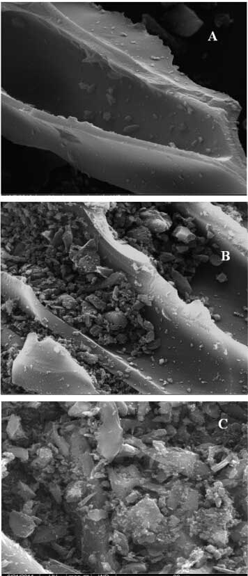 電子顯微鏡是用于研究材料表面形態(tài)的眾所周知的工具�;钚蕴亢透男曰钚蕴康膱D像(放大倍數(shù) = 5123×)如圖2所示。由于被鉻黑藍(lán)覆蓋,在簡(jiǎn)單的活性炭和其修改后的改性活性炭之間存在顯著的差異。在鉛離子攝取后,改性活性炭表面在顯微照片中也出現(xiàn)不同(圖2C)。