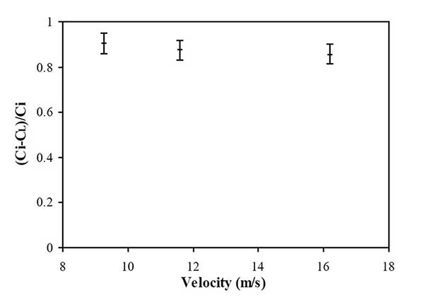 旋風(fēng)分離器系統(tǒng)對(duì)應(yīng)于具有強(qiáng)大的慣性力場(chǎng)的移動(dòng)床粒子。雖然活性炭尺寸和流速兩個(gè)參數(shù)在吸附過程中都起著關(guān)鍵作用,但顆粒尺寸有更明顯的趨勢(shì)。基于劇烈的湍流,高流速形成更好的混合條件,但使吸附劑顆粒的停留時(shí)間極短,這可能降低與旋風(fēng)分離器內(nèi)的目標(biāo)氣體流動(dòng)的接觸概率。例如,350升/分鐘(1pm)的流速導(dǎo)致16.2米/秒的入口速度,從而導(dǎo)致在旋風(fēng)分離器的混合室內(nèi)停留時(shí)間大約為0.14秒。因此,為了有效利用活性炭顆粒直至完全吸附,顆粒應(yīng)盡可能多次重復(fù)使用。