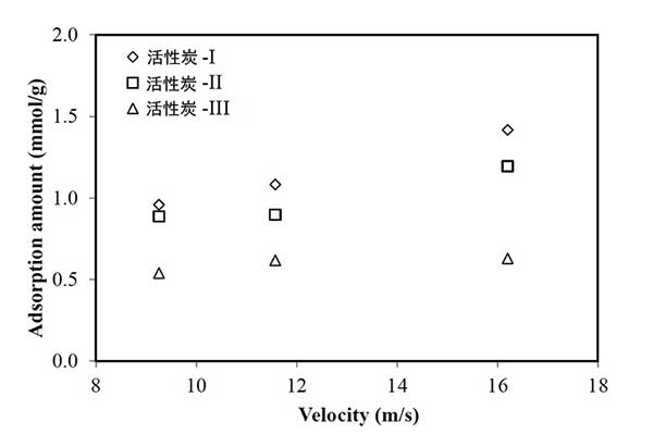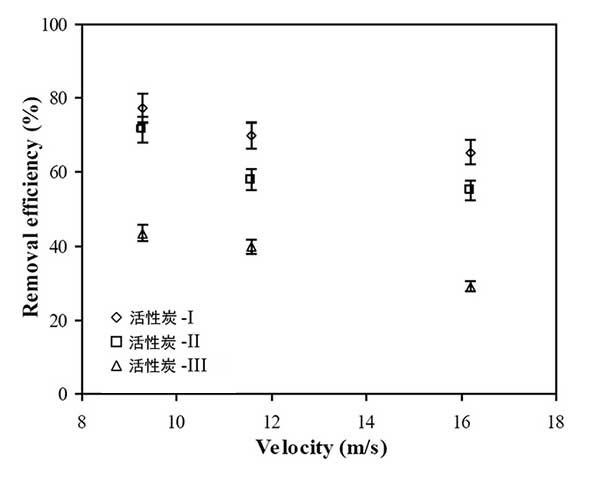 流速同時(shí)影響氣體吸附和活性炭回收,因?yàn)樗婕皻怏w和活性炭顆粒的混合程度、。圖3在各種活性炭吸附劑尺寸下,氣體去除效率和流量之間呈現(xiàn)出輕微的反比關(guān)系。最小的吸附劑(活性炭-1)以9.26米/秒除去77.4%的甲苯蒸氣,然后以16.2米/秒降至65.4%。微�;钚蕴课絼┎东@沿著旋風(fēng)分離器的流動(dòng)路徑行進(jìn)的甲苯蒸氣。雖然在前面的的內(nèi)容說(shuō)過吸附量以高速增加,但是氣體去除效率相當(dāng)?shù)�。這是因?yàn)樵诟吡髁肯录妆降慕^對(duì)體積要高得多。因此,即使活性炭吸附得更多,更多的氣體分子傾向于流出而沒有在內(nèi)部吸收。因此,關(guān)于顆�;厥蘸蜌怏w去除效率的最佳流量必須通過在各種操作條件下的眾多實(shí)驗(yàn)來(lái)確定。