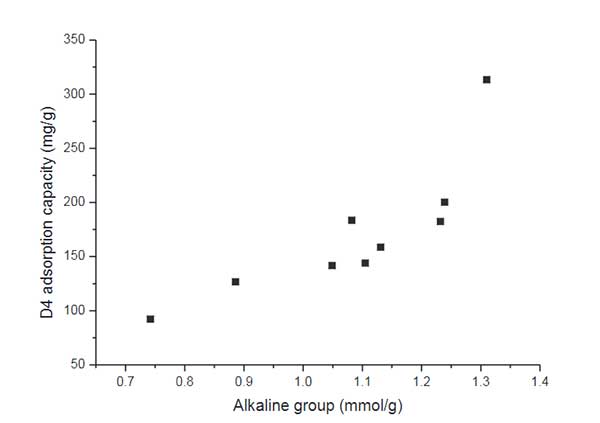 圖2.堿性基團(tuán)濃度與堿性活性炭的硅氧烷吸附容量之間的關(guān)系。
