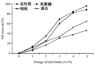 通過改變吸附劑的重量,以100rpm的混合速率,1小時,分析不同吸附劑用量(wt。%)對活性炭與沸石相比對MEA去除殘留油的影響�;旌蠒r間,在25-30℃的溫度下接觸時間為1小時。測試在樣品的原始pH下進行,即11.21。在CO 2去除單元系統(tǒng)中根據(jù)需要維持pH水平。圖1顯示了使用活性炭和沸石從MEA廢水中去除殘留油的百分比。從圖1中可以看出觀察到,在最高吸附劑用量(5重量%)下,活性炭與其他物質(zhì)相比顯示出最高的殘油去除率�;钚蕴砍晒Τ�87%的殘油,沸石為46%�?梢缘贸鼋Y(jié)論,活性炭最好比其他吸附劑更好地除去殘油。