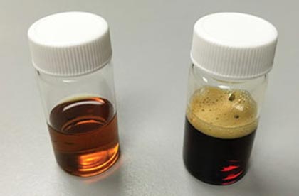 圖4.左小瓶經(jīng)過活性炭過濾。右小瓶未經(jīng)過活性炭其中的泡沫穩(wěn)定長達4小時。