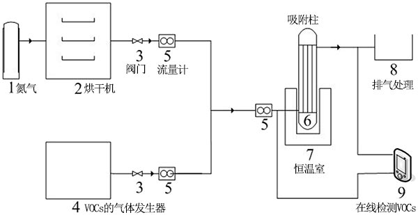 在吸附柱中研究了活性炭吸附甲苯的能力�;钚蕴康挠昧繛�10g,吸附質(zhì)甲苯氣體由氣體發(fā)生器產(chǎn)生。通過測定吸附前后甲苯的濃度,得到了不同條件下活性炭吸附性能的數(shù)據(jù)。實(shí)驗(yàn)吸附裝置的流程圖如圖2所示。將來自氣體發(fā)生器的甲苯氣體與氮?dú)饣旌�,然后將其吸附在恒溫吸附塔中。通過在線FID檢測器測量吸附前后的甲苯含量,并通過流量計(jì)控制甲苯流量。當(dāng)脫氣和入口濃度在30分鐘內(nèi)保持一致時(shí),認(rèn)為已達(dá)到吸附平衡。吸附氣體通過廢氣出口排空。