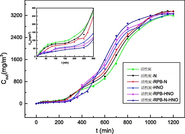 甲苯在不同活性炭上的穿透曲線和吸附等溫曲線如圖3所示和4。不同活性炭上的吸附速率從高到低依次為:活性炭-RPB-N-HNO>活性炭-RPB-HNO>活性炭-HNO>活性炭-RPB-N>活性炭-N>原始活性炭。吸附速率越大,滲透時(shí)間越長,這又與活性炭的復(fù)雜孔徑分布和表面官能團(tuán)的量有關(guān)�;钚蕴康奈⒖左w積在高溫氮?dú)庵性龃�,這增加了活性炭通道的內(nèi)部孔隙體積。在高重力氮?dú)猸h(huán)境中,不利于甲苯吸收的原始活性炭的內(nèi)部結(jié)構(gòu)被重新分配并分裂成新的空間構(gòu)型,這進(jìn)一步增加了突破時(shí)間。HNO 3處理的活性炭的突破時(shí)間在高重力環(huán)境中的改性大于具有HNO 3浸泡的改性活性炭。這是因?yàn)镠NO 3分散的細(xì)小液滴中,這增加了其與活性炭的表面和內(nèi)部的接觸概率,這反過來增強(qiáng)了活性炭上含氧官能團(tuán)的負(fù)載并增加了它們的吸附效率。在重力作用下,復(fù)合改性處理的活性炭具有較長的穿透時(shí)間和較大的吸附速率,因?yàn)槲锢砀男栽黾恿吮缺砻娣e,增大了孔體積分布,而化學(xué)改性增加了表面氧基團(tuán)數(shù)。反過來,這些特性增強(qiáng)了吸附性能。