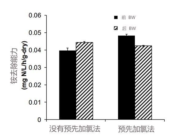 圖2顯示了反洗前后活性炭的銨去除能力的變化。沒有預(yù)氯化,銨去除能力為0.040mgN/L/h/g-dry。在第一次取樣后反洗(p<0.01)后,它增加了12%。另一方面,當實施預(yù)氯化時,去洗后的去除能力降低了12%(從0.048到0.042mg N/L/h/g-dry)(p<0.01)。