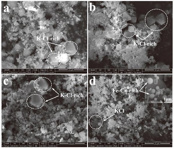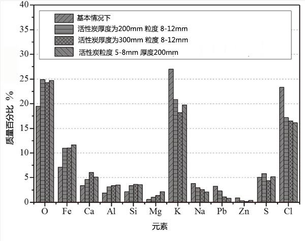 圖4顯示了煙氣通過活性炭之前和之后的化學組成�?梢园l(fā)現(xiàn)PM 2.5中的+ Fe,Ca,Si,Al和Mg的含量在煙氣通過活性床時比基礎情況下都有所增加,而K,Na,Pb的含量, PM 2.5中的 Zn和Cl都出現(xiàn)了下降。圖5給出了煙氣經(jīng)過活性炭層后在過濾器中收集的PM 2.5的SEM圖像,觀察到經(jīng)活性炭去除后,較大顆粒的數(shù)量主要由K和Cl組成減少(圖5)(b)-5(d))與基本情況比較(圖5(a))雖然有許多較小的顆粒,如球形顆粒(圖5(d)),主要包含F(xiàn)e和Ca這種現(xiàn)象與PM 2.5的化學成分變化非常一致。此外,與使用厚度為200毫米,粒度為8-12毫米的活性炭床的情況相比(圖5(b)),出現(xiàn)了較少的大的富含K-Cl的顆粒,并且出現(xiàn)了許多較小的球形富含F(xiàn)e-Ca的顆粒。