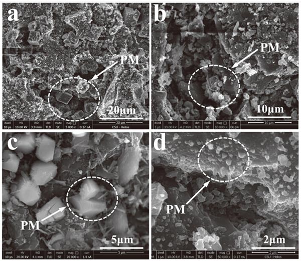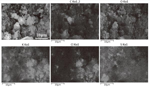 圖5顯示了粘附顆粒物質(zhì)后活性炭的形態(tài),其中可以發(fā)現(xiàn)許多顆粒分布在活性炭的孔隙或表面上。圖5(a)-5(c)中示出了分布在孔隙尺寸約20顆粒 μ米,5-10 μm和1 μ米。圖5(d)示出了分布式活性炭的表面上的顆粒,其直徑幾乎小于1 μ微米。圖6給出了分布在孔隙中的顆粒的SEM映射,表明大量顆粒富含K,并且它們主要以氯化物或硫酸鹽的形式存在。這些顆粒的出現(xiàn)對應于PM 2.5中K和Cl含量的降低。