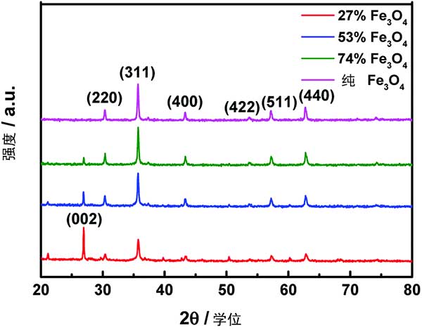 使用XRD衍射儀測量活性炭復合物的晶體結構。圖1顯示了所制備樣品的衍射圖案。在2的特征衍射峰θ= 31.24°,36.82°,44.76°,55.62°,59.30°和65.19°的與(220),(311),(400),(422),(511)和(440)Fe 3 O 4平面一致。此外,在約2峰值θ=26.20°被分配給蓬松結構化活性炭。觀察到Fe 3 O 4衍射峰的強度隨著Fe 3 O 4納米顆粒負載量的增加而增強,并且活性炭的強度在相同的過程中減少。上述現(xiàn)象表明Fe 3 O 4納米顆�?梢猿晒Φ匾肱钏山Y構的活性炭上。
