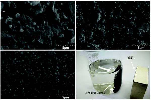 圖2:活性炭,活性炭復合材料,F(xiàn)e 3 O 4納米顆粒的SEM圖像與宏觀圖。