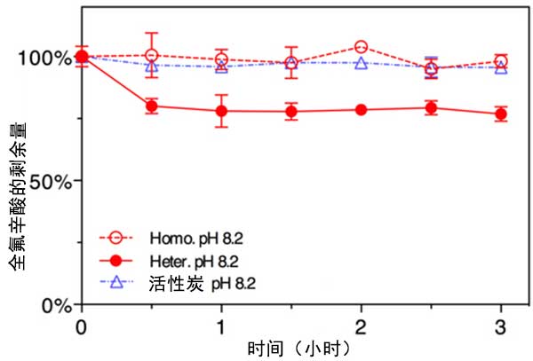在存在和不存在活性炭的情況下,在密封的40mL燒瓶中在酸性,中性和堿性pH條件下進(jìn)行全氟辛酸與S 2 O 8的反應(yīng),反應(yīng)溫度為80℃,用恒溫水浴保持。對(duì)于大多數(shù)實(shí)驗(yàn),初始全氟辛酸濃度為0.5μM,活性炭濃度為200 mg/L,500 mg/L或1000 mg/L。對(duì)于酸性和堿性條件實(shí)驗(yàn),使用濃硫酸或150mM氫氧化鈉溶液將pH值調(diào)節(jié)至1.0或13.0。對(duì)于在pH 8.2下進(jìn)行的實(shí)驗(yàn),使用100mM硼酸鹽作為緩沖液(NaB(OH)4/H 3 BO 4)。在所有實(shí)驗(yàn)中包括五個(gè)重復(fù)。