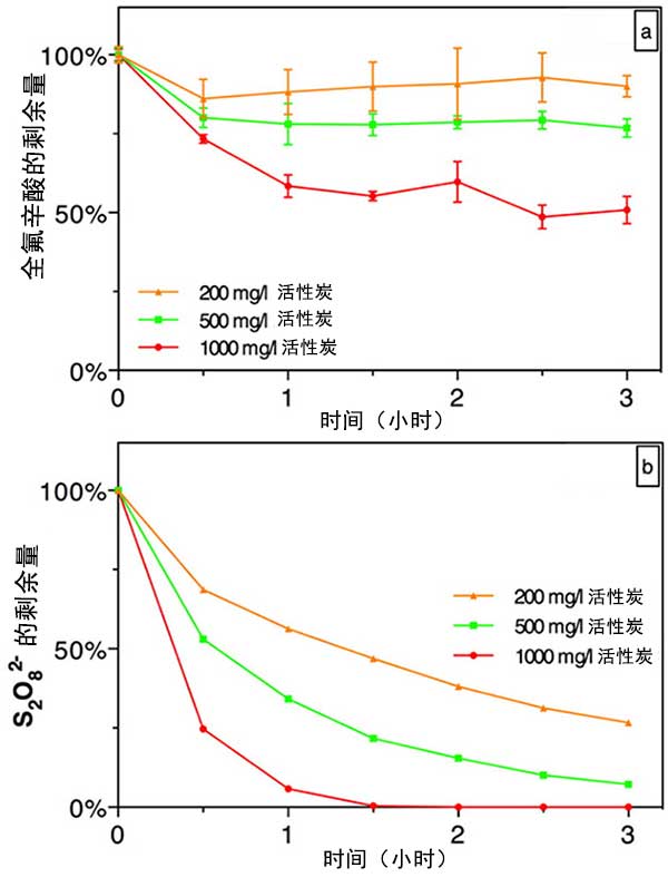 圖2�;钚蕴繚舛葘�(duì)化學(xué)吸附去除全氟辛酸(圖2a)和過(guò)硫酸鹽分解(圖2b)的影響。