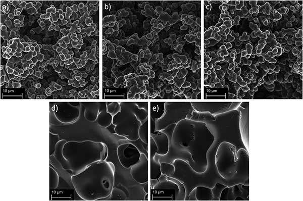 通過掃描電子顯微鏡對高比表面積活性炭進行表征于圖2a-c中。可以看出的是這幾種活性炭具有它是由球形碳顆粒的尺寸與周圍3μm的孔隙網(wǎng)絡(luò)結(jié)構(gòu),這是典型的基于甲醛樹脂活性炭。球形活性炭納米顆粒的燒結(jié)導致孔隙網(wǎng)絡(luò)內(nèi)的空腔,其在直徑為2至20μm的形成。活性炭表面是光滑的,沒有燒結(jié)的球形活性炭納米顆粒,而它們?nèi)匀辉诰W(wǎng)絡(luò)內(nèi)具有相似直徑的空腔。由于在化學活化之前低的預碳化溫度,球形納米顆粒在活化過程中強烈聚集,這導致如前所述的較不剛性的孔隙網(wǎng)絡(luò)。