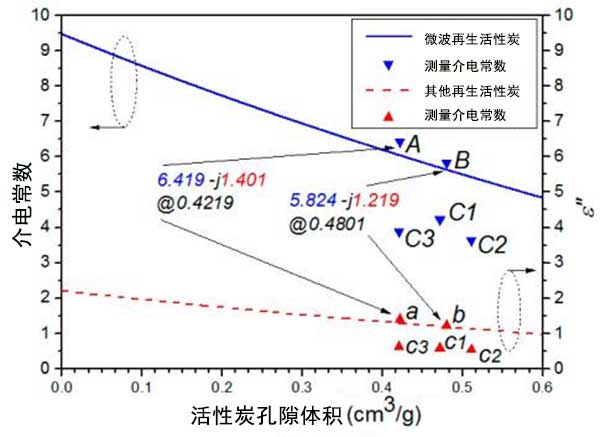 該研究為連接復(fù)介電常數(shù)和活性炭孔容提供了橋梁。此外,它能輔助活性炭達(dá)到快速表征提供了一種方便的方法。在未來的研究中,我們將嘗試在推導(dǎo)過程中考慮微波因子,并研究活性炭d介電常數(shù)和孔徑分布或不同吸收性(孔隙率)之間的關(guān)系。