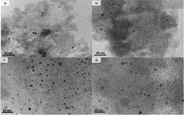 所有活性炭催化劑都顯示出高BET表面積。在二氯甲烷加氫脫氯中使用后沒(méi)有觀(guān)察到顯著差異,這消除了碳質(zhì)沉積物阻塞多孔結(jié)構(gòu)作為催化劑失活的原因。CO化學(xué)吸附結(jié)果表明,鉑在所有活性炭催化劑中均勻分散,它們之間略有不同。高Pt分散可歸因于活性炭的高表面積及其表面化學(xué)性質(zhì),這在催化劑制備過(guò)程中引起活性相與載體之間的相互作用。TEM圖像(圖1)和金屬粒度分布(圖2)證實(shí)了在鉑在兩種不同活性炭中形成Pt納米顆粒,平均尺寸值分別為1.6和2.0nm。