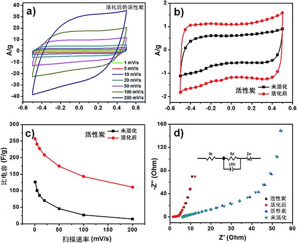 在不同掃描速率下觀察到兩種活性炭的準矩形CV曲線(圖3a),這暗示了非理想的電容行為。我們還觀察到活化后的活性炭的CV環(huán)路較大,這意味著它具有比未活化的活性炭更大的電容(圖3b)。具體電容的總結如圖3c所示,活化后活性炭獲得的高電容為270,而沒活化的活性炭為125。這種高電容可歸因于諸如高表面積,分級孔徑分布和活性炭的表面潤濕性等因素。對于兩種活性炭,由于電解質(zhì)不足以擴散到電極材料的內(nèi)孔中而觀察到對應于掃描速率增加的比電容的降低。