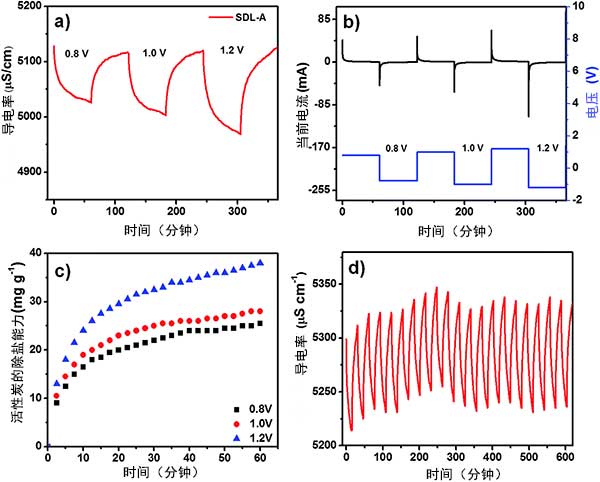 在充電步驟期間,在兩個電極上向膜電容去離子施加正電勢,以從已知NaCl濃度的溶液中吸附離子,并施加負電位以使電極放電并排出廢物流中的離子。圖4a顯示了在NaCl溶液中0.8V至1.2V的各種電位下,活性炭在初始濃度2500mg L-1下的脫鹽性能。在所有施加的電位中,在充電期間首先觀察到溶液電導率的急劇下降,并且當吸附接近平衡時,電導率的變化減小直至達到平臺。圖4b示出了具有增加電勢的正相關電流瞬變,而圖4c顯示了活性炭電極在不同施加電位下的鹽吸附容量。從0.8V到1.2V,鹽吸附容量從23增加到38mg g-1,表明更高的電池電位可以提高電吸附能力。觀察到的現(xiàn)象可歸因于強靜電力的存在以及在增加的電壓下形成較厚的雙電層。圖4d示出了活性炭電極的循環(huán)穩(wěn)定性,在2500mg L-1的NaCl溶液超過20次充放電循環(huán)而沒有去除能力任何明顯的損失。該結果證實了使用活性炭當電極可以再生和重復使用而沒有任何損耗,活性炭是成為用于膜電容去離子應用的電極材料的好材料。