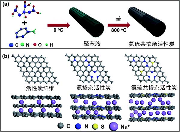 圖1:(a)氮硫共摻雜活性炭合成的示意圖,以及(b)具有不同幾何構(gòu)型和不同層間距離的三種活性炭對鈉儲存的行為。