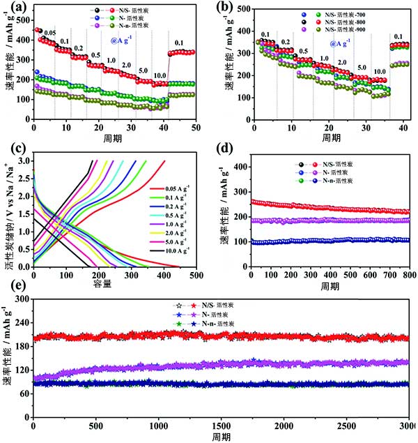 為了進一步描述制成活性炭的電化學(xué)行為,進行循環(huán)伏安法和恒電流充電放電測試。為了證明活性炭的優(yōu)點,還在相同的質(zhì)量負載下測試了幾種活性炭的Na儲存性能,圖2a顯示了在0.05至10Ag-1的不同電流密度下測試5個循環(huán)。與其他兩個樣品相比,氮硫共摻雜活性炭顯示出優(yōu)異的速率性能,在高速測量之后仍然可以恢復(fù)高比容量。對于沒有S摻雜的活性炭,當(dāng)電流密度增加時,電極提供的容量降低。相比之下,不同電流密度下的恒電流充電放電曲線進一步證實了這些速率的結(jié)果。因此,氮硫共摻雜活性炭電極表現(xiàn)出比其他對照樣品好得多的速率性能和優(yōu)異的鈉儲存性能。