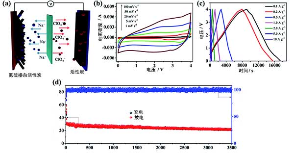 如圖3a所示,使用氮硫共摻雜活性炭作為陽極并且商業(yè)活性炭作為陰極在電解質(zhì)溶液中構(gòu)建的鈉離子電容器裝置。在充電過程中,ClO 4-離子在活性炭的多孔結(jié)構(gòu)中被吸收,而來自電解質(zhì)的Na離子被插入到氮硫共摻雜活性炭中。放電過程與充電過程相反。在制造鈉離子電容器之前,氮硫共摻雜活性炭電極在預(yù)活化10個循環(huán)在Na離子半電池中獲得高效率,然后放電至0.01V的截止電壓。此外,研究了活性炭作為陰極的電化學(xué)性能,以評估陰極和陽極之間的電荷平衡�;钚蕴康谋缺砻娣e高達1500以上。根據(jù)活性炭陰極和氮硫共摻雜活性炭陽極的比容量值,鈉離子電容器中氮與硫摻雜活性炭的質(zhì)量比為3:1。