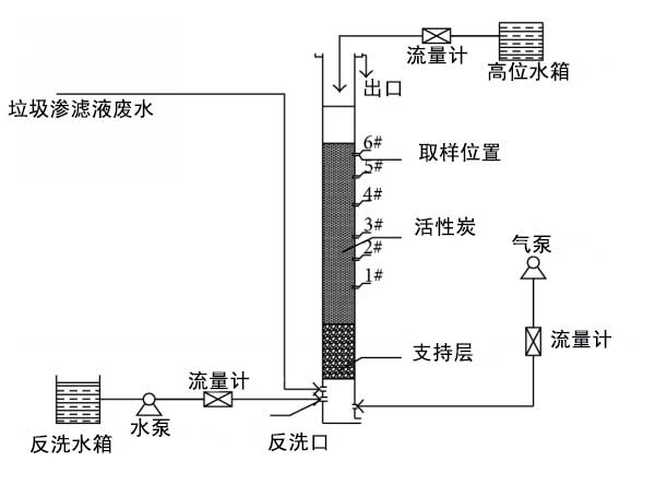 活性炭反應(yīng)器工藝流程圖如圖1所示�;钚蕴砍赜捎袡C(jī)玻璃制成,有機(jī)玻璃是柱式反應(yīng)器�;钚蕴砍馗叨葹�2米。內(nèi)徑為63毫米。填充高度為1800毫米。碳層高度為1500毫米。砂濾器高度為300毫米。反應(yīng)體積為4.7 L.有5個(gè)水取樣口和碳池。底部有曝氣器,碳池頂部有溢流堰。水質(zhì)分析指標(biāo)為紫外分光光度法和紫外分光光度計(jì)。