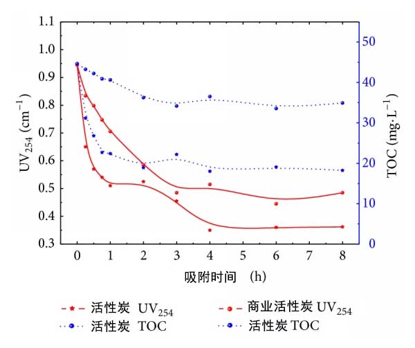 根據(jù)圖4,活性炭表現(xiàn)出良好的吸附生化水的性質(zhì)。UV254和TOC的濃度具有類似的變化趨勢(shì)。UV254和TOC的去除效率分別為63.0%和59.7%。商業(yè)活性炭的吸附性能較弱。UV254和TOC的去除率僅為52.9%和24.8%。商業(yè)活性炭的孔體積小于活性炭的孔體積。圖4中活性炭的UV254去除曲線分為兩個(gè)階段,它們分別對(duì)應(yīng)于膜擴(kuò)散和粒子擴(kuò)散。