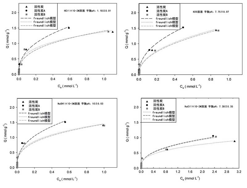 從圖3可以看出,在所有測試的實驗條件下,當平衡濃度較低(即<0.1mmol L-1)時,對羥基苯甲酸甲酯吸附量的差異三種活性炭最小,而對于較高的平衡濃度,活性炭A表現(xiàn)出最高的性能,活性炭和活性炭B具有相似的行為,除非離子強度發(fā)生變化。事實上,在后一種情況下,熱處理樣品顯示出最佳性能并且?guī)缀跸嗨�。為了詳細分析檢索到的結(jié)果,需要進一步調(diào)查,建模分析可能會有所幫助。
