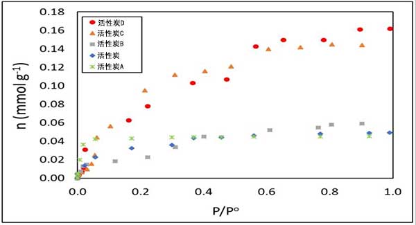 圖1顯示了本研究的五種活性炭在-10℃下的己烷吸附等溫線。吸附的己烷的最高毫摩爾值是暴露于熱活化的活性炭,并且當活化溫度增加時這些量增加。吸附數(shù)據在范圍內具有不確定性,這使得可以區(qū)分相同等溫線中的吸附值,并且顯示所研究的活性炭的吸附差異。例如,對于相對壓力大于0.7的活性炭,每個點的吸附值是不同的,盡管這些值是低值。