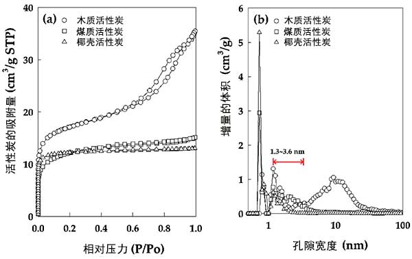 圖2:活性炭的物理性質(zhì)。(a)氮的吸附/解吸等溫線和(b)活性炭的孔徑分布。