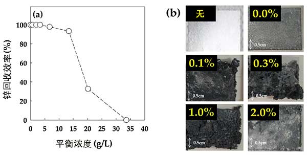 如圖4所示,在吸附物濃度為0.00-0.50%存在下的鋅回收效率至少恢復(fù)99.9%。在超過0.50%的吸附物存在下,鋅回收效率趨于迅速降低。一個電極的表面由具有不同吸附內(nèi)容物的電解質(zhì)中回收,在沒有吸附物的情況下,電極表面顯示出均勻的沉積。然而,對于0.1-2%的吸附物,電極表面看起來非常不均勻地生長。向電解質(zhì)中添加有機(jī)物改變了金屬沉積物的特征。從顯微鏡分析中,向電解質(zhì)中添加有機(jī)物導(dǎo)致在沉積表面上形成孔。因此,吸附物的存在降低了鋅的回收效率并導(dǎo)致不均勻的沉積。因此,去除吸附物必須小于0.1%。