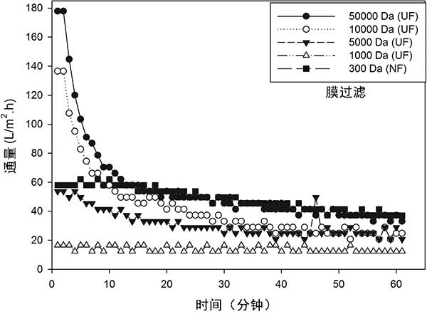 在膜過濾測試中,使用四個UF膜和一個NF膜。研究了1小時的通量變化,并監(jiān)測了降低的通量。在UF膜觀察到較高的通量降低。過濾1小時后,隨著截留分子量從50,000 Da減少到1,000 Da,通量下降也減少了。對于10,000 Da UF膜,在初始通量1小時過濾后損失了82%的通量。1,000 Da UF膜顯示出較低的通量在圖2顯示�?讖绞怯绊懩み^濾通量的最重要參數(shù)之一,也是影響活性炭吸附能力的參數(shù)。通量也受膜結(jié)構(gòu),水中成分和廢水pH的影響。有些膜有很高的同量主要是由于膜表面與廢水成分之間的靜電相互作用。