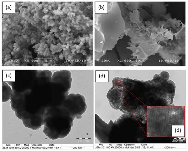 使用SEM,TEM,TGA和XRD分析活性炭的表面形態(tài),熱性質(zhì)和結(jié)晶度。用作活性炭前體的圖像(圖1a,c)顯示其典型的形態(tài)為花椰菜樣結(jié)構(gòu),這種形態(tài)似乎是由于與其中摻雜地嵌入無序聚合鏈形成的。然而,聚吡咯的球形結(jié)構(gòu)通過碳化過程被破壞,導(dǎo)致粗糙,粗糙的表面由不規(guī)則的尖角和剝離狀顆粒組成,在SEM圖像中幾乎沒有孔隙的跡象�;钚蕴烤圻量┑腡EM圖像如圖1d所示表示觀察到均勻分布的微孔。此外,TEM圖像描繪了高度豐富和對(duì)稱的孔隙,表面積和微孔率的值對(duì)應(yīng)于該活性炭。發(fā)現(xiàn)隨著活化劑用量的增加,表面積增加,孔隙率增加。