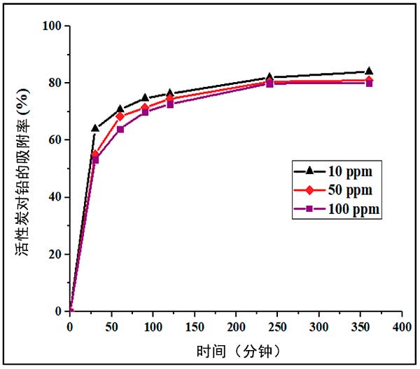圖2:在三種不同濃度下,活性炭對(duì)鉛離子的吸附百分比與時(shí)間的關(guān)系。