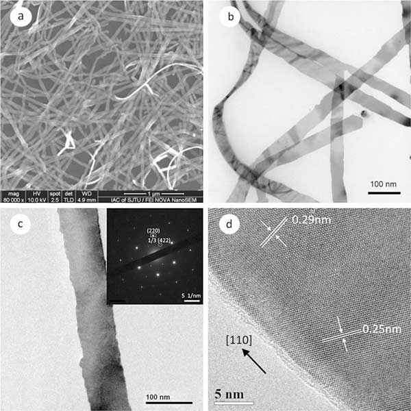 圖1顯示了在活性炭上生長的銀納米帶的典型電子顯微鏡(EM)圖像。SEM圖像(圖1a)顯示獲得了豐富的線狀產(chǎn)物,具有非常少的準球形顆粒雜質(zhì)。圖1b是銀納米帶的典型TEM圖像。該圖中所示的納米帶的平均寬度為約45納米。從左側(cè)附近的扭曲納米帶測量的厚度為約9納米。位于TEM網(wǎng)格上的這種平坦且光滑的納米結(jié)構(gòu)也通過右側(cè)的莫爾圖案來證實,其源自具有不同晶體取向的兩個或三個納米帶的堆疊。圖1c呈現(xiàn)單個納米帶的TEM圖像。其選擇區(qū)域電子衍射(SAED)圖案插入右上角,具有六重對稱性。