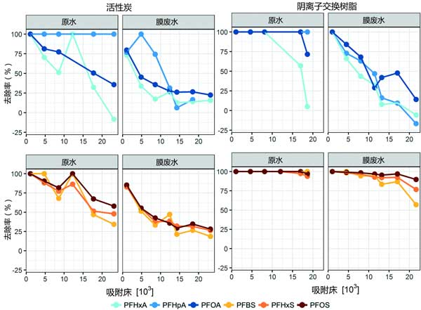 實驗總計進行了12周,每兩周取樣。這導(dǎo)致所有活性炭色譜柱的實驗運行時間為24個,分別處理原水和膜廢水的陰離子交換樹脂色譜柱。在每次采樣之后每周對所有柱進行反洗,以模擬典型的全尺寸操作�?偣卜治隽�15種全氟烷基物質(zhì),將吸附材料相對于全氟烷基物質(zhì)去除的性能與柱吸附模型的性能進行了比較。