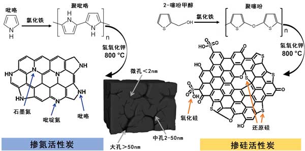 圖2:使用氫氧化鉀作為活化劑從聚吡咯和聚噻吩合成氮?dú)鈸诫s和硫摻雜的活性炭的示意圖。