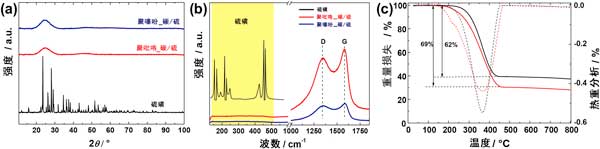 圖3:硫聚吡咯活化的分級(jí)碳硫和聚噻吩活化的分級(jí)碳硫復(fù)合物的XRD衍射圖和拉曼光譜。