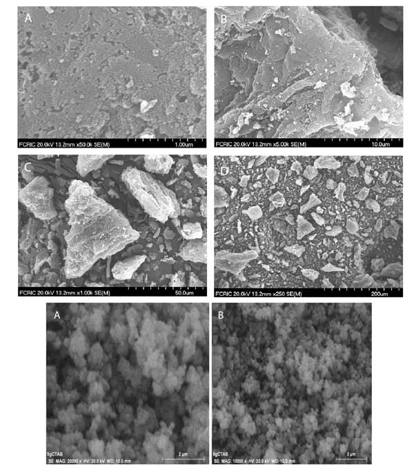 圖1呈現(xiàn)活性炭的掃描電子顯微鏡(SEM)圖像,其示出了活性炭的結(jié)構(gòu)和表面表征。圖像顯示碳顆粒的平均尺寸為約20nm,并且這些顆粒聚集在一起并形成平均尺寸為25μm的角形簇�?紫堵蕿�17.78%�?梢钥闯龃氐谋砻媸瞧教沟�,粗糙的和多孔的。最后兩幅顯示的活性炭摻雜二氧化鈦的圖像。在嚴(yán)格攪拌下,將丁醇鈦溶液加入到含有活性炭的擬均勻溶液中,可能形成二氧化鈦,其中活性炭顆粒將其裝飾。